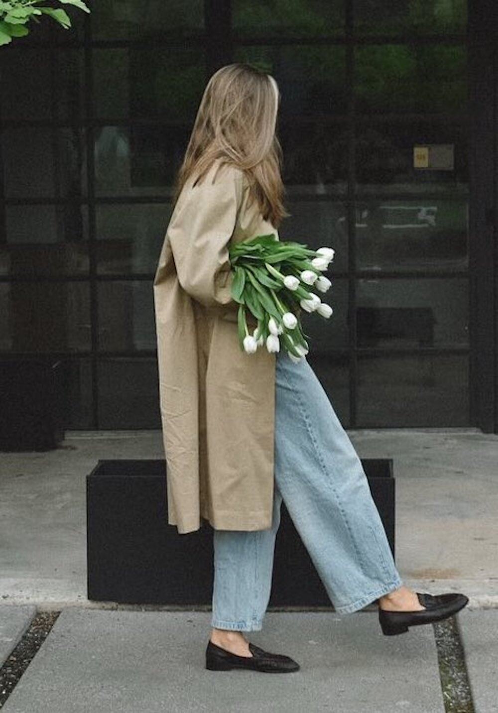 Last on this list of chic April outfits, for a day of strolling through a spring farmers’ market or grabbing a latte with your bestie, opt for simple, wide-leg jeans and a long trench coat. You can never go wrong with this combination in April, and the loafers dress these pieces up enough for a polished look that’s still wearable.