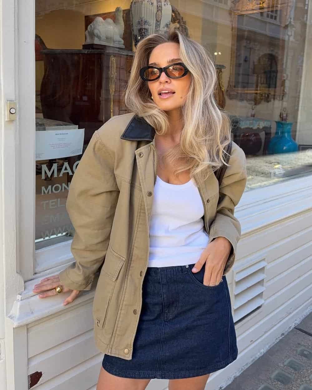 A refreshing and somewhat flirty look is never a bad idea for warm spring days, and Julie has really nailed that aesthetic here. A dark denim skirt and a simple scoop-neck tank or tee are cute on their own, while the tan bomber jacket adds a stylish, functional layer.