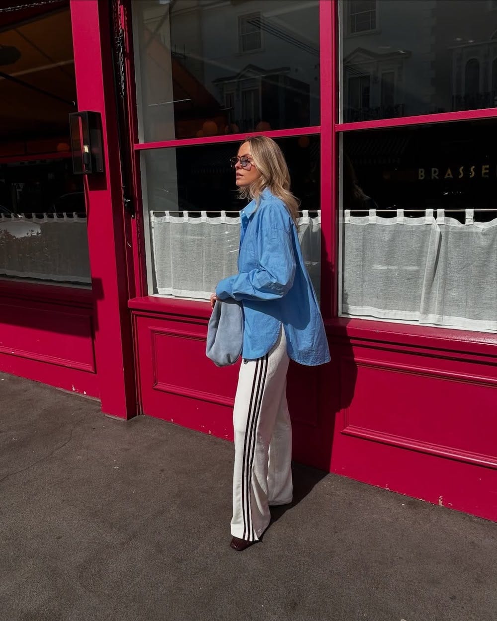 Breezy bottoms are ideal for spring, and the striped detailing adds a sporty touch, which is very much on trend for this season. I love how Martha paired this with an oversized blue button-up, adding an effortless layer that will work whether the day is cool or warm.