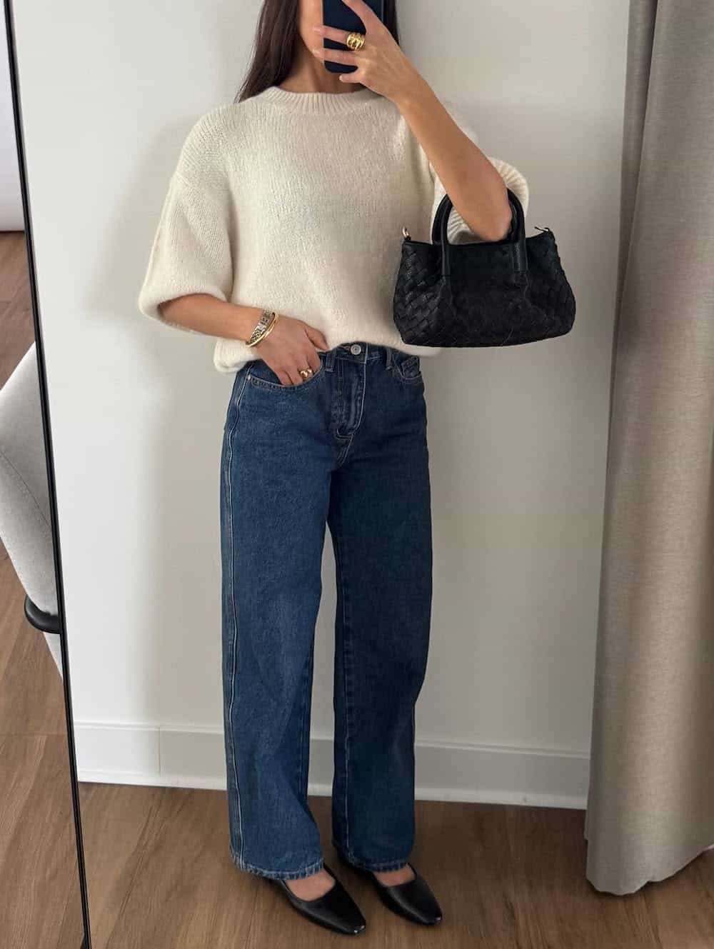 Classic spring wardrobe staples in neutral tones can easily be paired together for classy April outfits. Ecru jeans and a slim-fitting black cardigan are always in my spring capsule wardrobe, and together they create a base that feels simple but can be dressed up in no time.