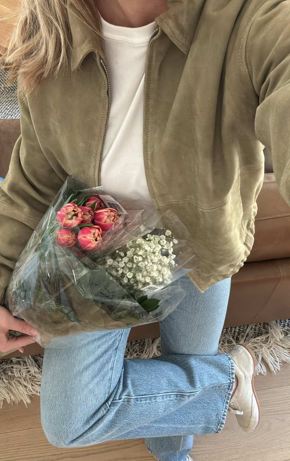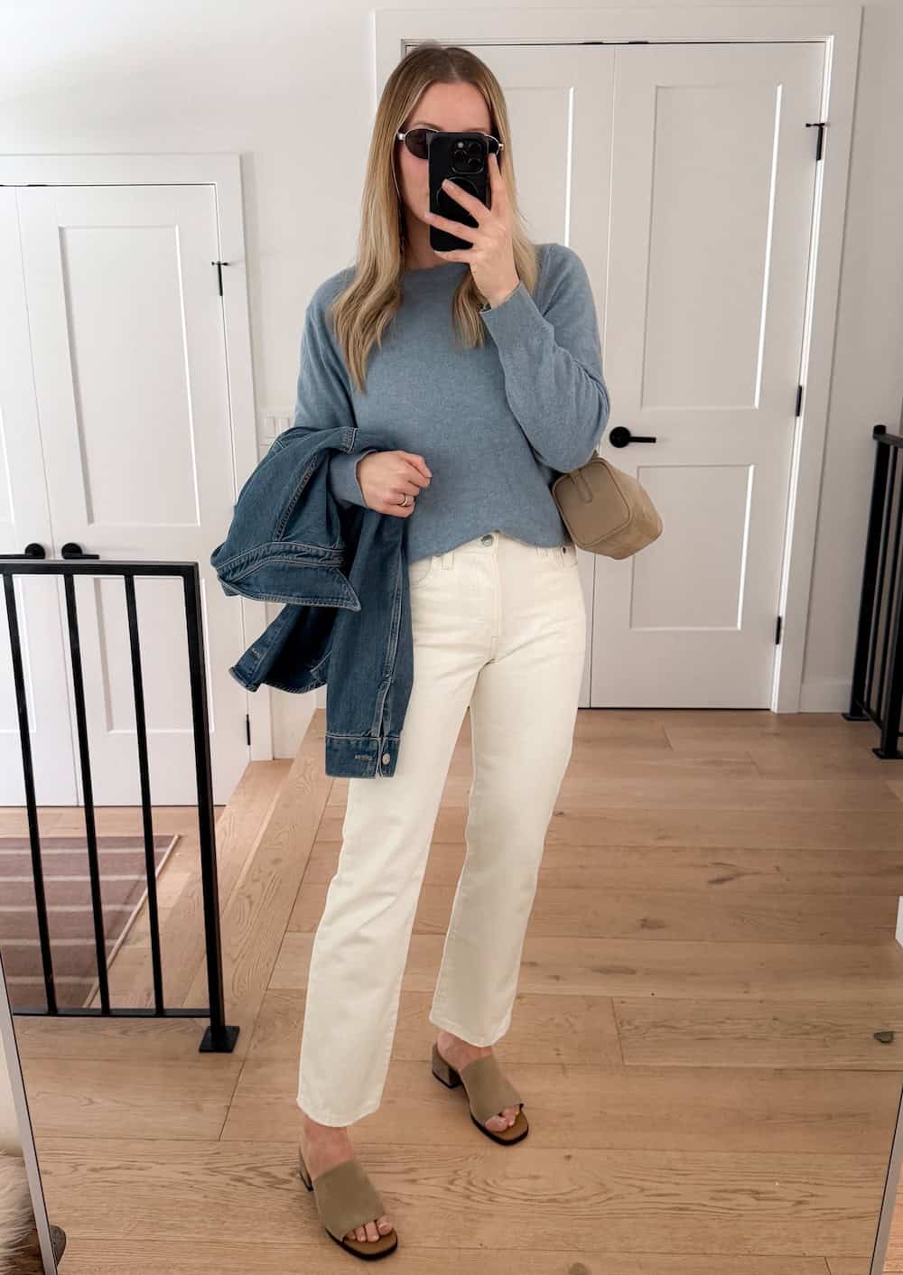 These pieces are my go-to for something light, airy, and spring-ready. Off-white jeans and a soft blue sweater are perfect spring pieces, and I love to bring along a denim jacket for added texture and another layer (just in case).