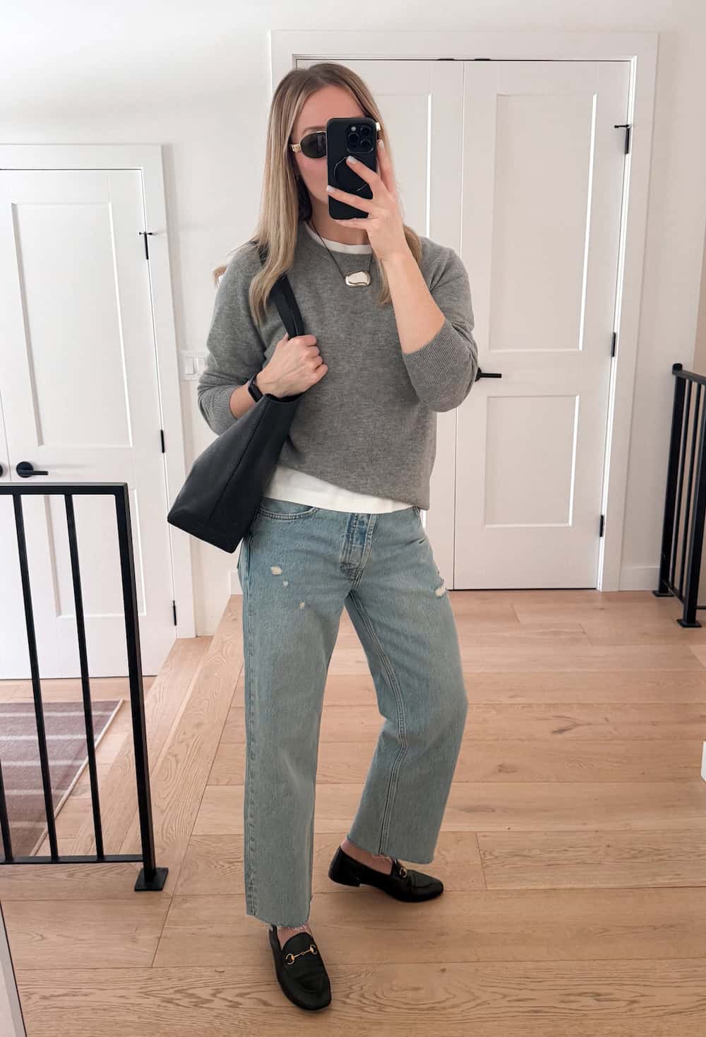 I love layering a classic sweater over a crisp white tee; it makes it easy to adjust my look throughout the day if needed while still looking put-together. Light blue denim is ideal for this season, and simple pieces and accessories finish the look effortlessly. Gold embellished loafers, a sleek black tote, and my favorite minimalist jewelry always add an elevated touch and make me feel polished enough for a day out and about.