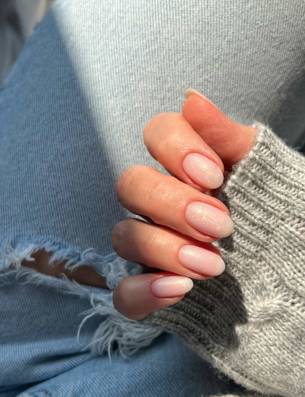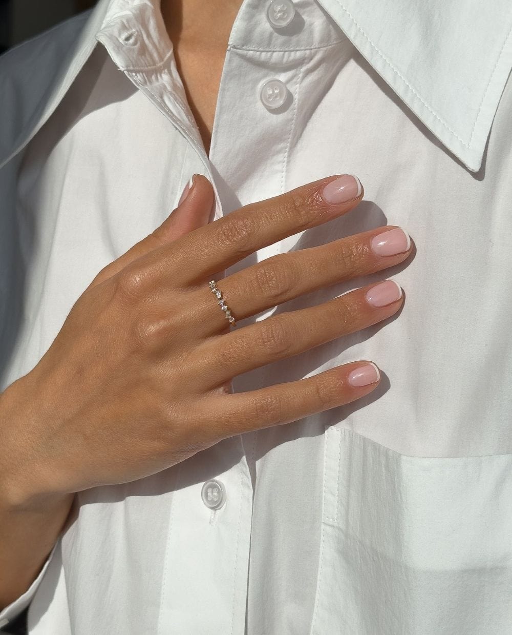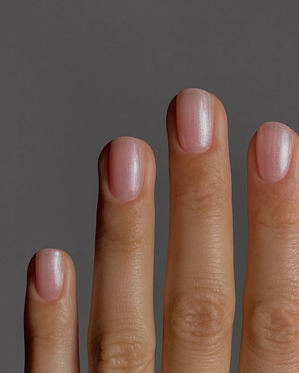 Simple, sheer, shimmery pink easily adds a springtime vibe, but the soft tone and understated design means this manicure will work for any spring old money outfit.